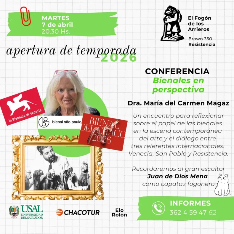 El próximo martes 7 de abril, a partir de las 20.30, se realizará la apertura oficial de la temporada cultural con la conferencia titulada “Bienales en perspectiva. Venecia, San Pablo y Chaco”, que estará a cargo de la Dra. María del Carmen Magaz. El encuentro tendrá lugar en El Fogón de los Arrieros y propone una reflexión sobre el rol de las bienales en la escena contemporánea del arte, poniendo en diálogo tres referentes clave: Venecia, San Pablo y Resistencia.